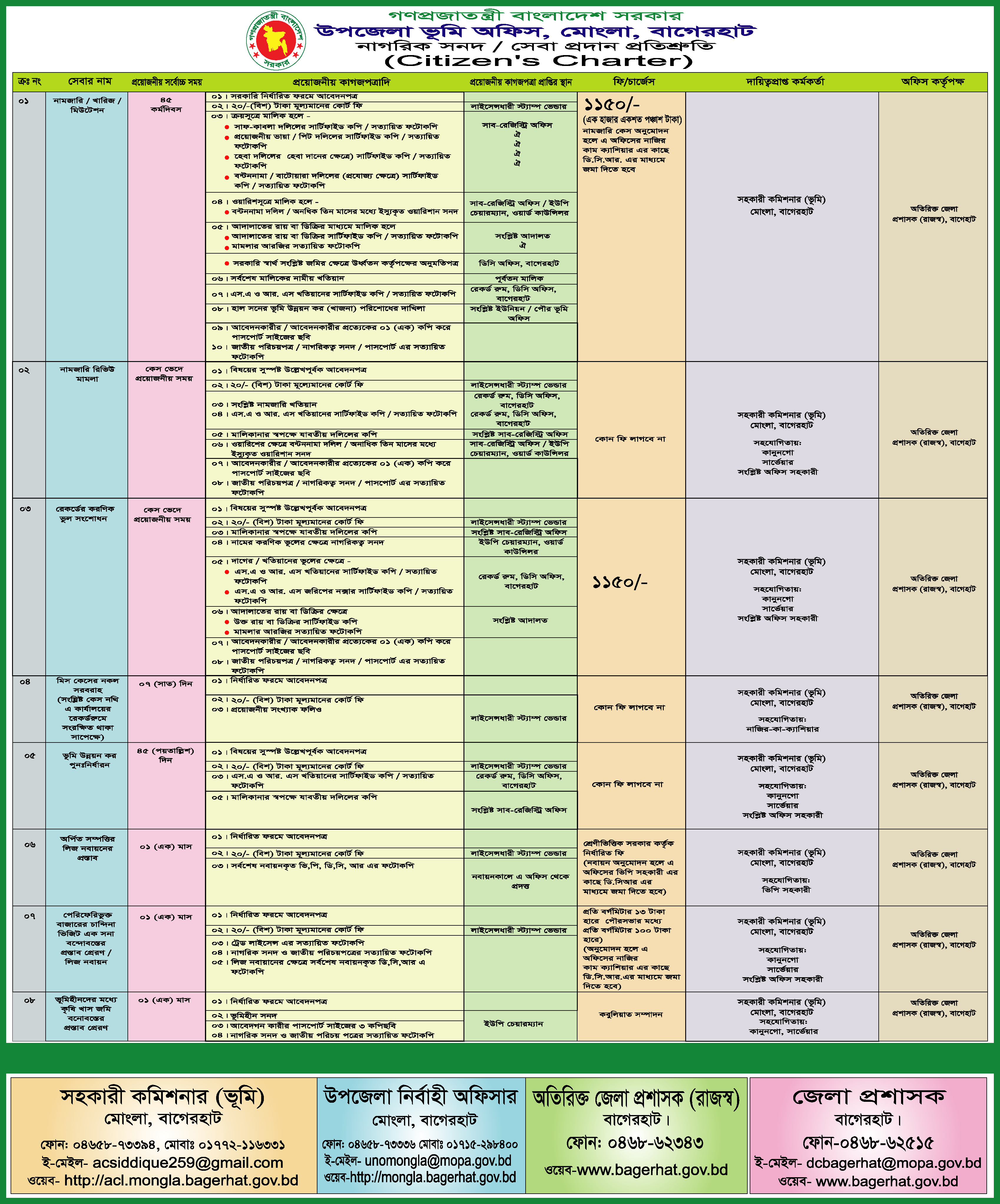০১. নামজারী জমা খারীজ ত্ত জমা একত্রী করণ ব্যক্তি বা প্রতিষ্ঠান সরকার কর্তৃক নির্ধারিত ফরমে ছবিসহ আবেদনের প্রেক্ষিতে রাষ্ট্রীয় অধিগ্রহণ ও প্রজাস্বত্ত্ব আইন ১৯৫০ এর বিধান মতেনামজারী-জমাখারিজ-জমাএকত্রিকরণ তথা রেকর্ড সংশোধন করা হয়ে থাকে। এ সেবা পাোয়ার জন্য বর্তমানে ৪৫ কার্যদিবস সময় লাগে। এজন্য খরচ পরবে ২৫০ টাকা।